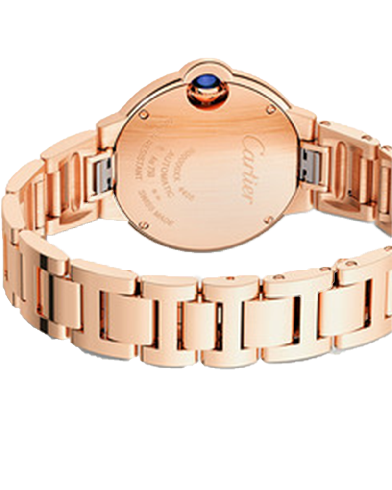 Ballon Bleu de Cartier watch, 33 mm, mechanical movement with automatic winding. Rose gold 750/1000 case set with 47 brilliant-cut diamonds totalling 0.68 carats, fluted crown set with a sapphire cabochon, ros sunray-brushed dial, blued-steel sword-shaped hands, sapphire crystal, rose gold 750/1000 interchangeable bracelet. Case thickness: 10.16 mm. Water-resistant to 3 bar (approx. 30 metres).