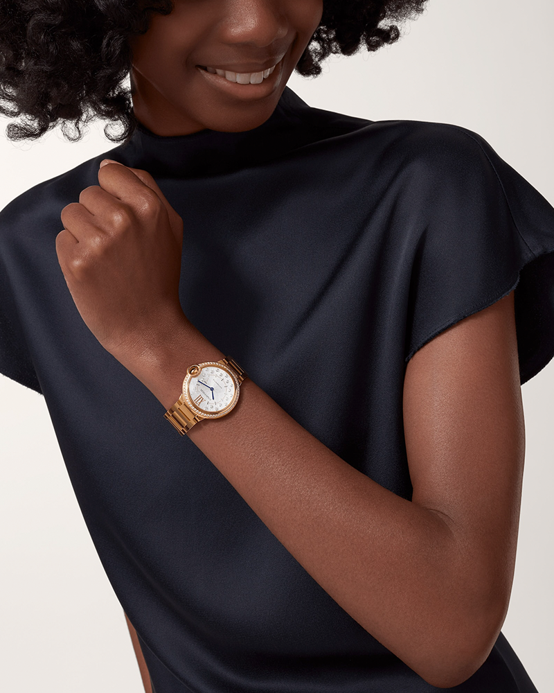 Ballon Bleu de Cartier watch, 36 mm. Self-winding mechanical movement. Rose gold 750/1000 case set with 54 brilliant-cut diamonds totaling 0.78 carats. Fluted crown decorated with a cabochon sapphire. Matt silvered stamped sunray dial set with 21 brilliant-cut diamonds totaling 0.19 carats. Blued-steel sword-shaped hands. Sapphire crystal. Interchangeable bracelet in rose gold 750/1000. Thickness: 0.47 . Water-resistant up to 3 bar (approx. 30 meters/100 feet).