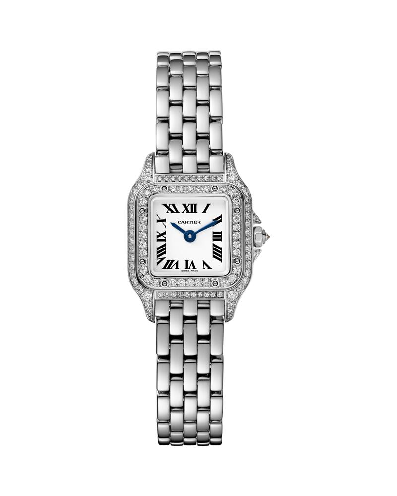 Panthere de Cartier watch, mini model, quartz movement. Rhodium-finish 18K white gold case set with brilliant-cut diamonds. Rhodium-finish 18K white gold octagonal crown set with a brilliant-cut diamond. Silvered dial, blued-steel sword-shaped hands, sapphire crystal. Rhodium-finish 18K white gold bracelet.