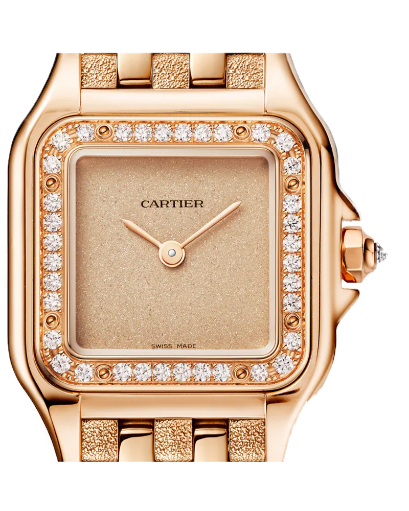 Panth re de Cartier watch, small model, quartz movement. 18K rose gold (750/1000) case set with 37 brilliant-cut diamonds totaling 0.26 carats. Dimensions: 22 mm x 30 mm, thickness: 6 mm. 18K rose gold (750/1000) octagonal crown set with a brilliant-cut diamond totaling 0.02 carats. Rose gold-colored grained dial with sparkling effect, rose gold-colored-finish sword-shaped hands, textured 18K rose gold (750/1000) bracelet. Water-resistant up to 3 bar (approx. 30 meters/100 feet).