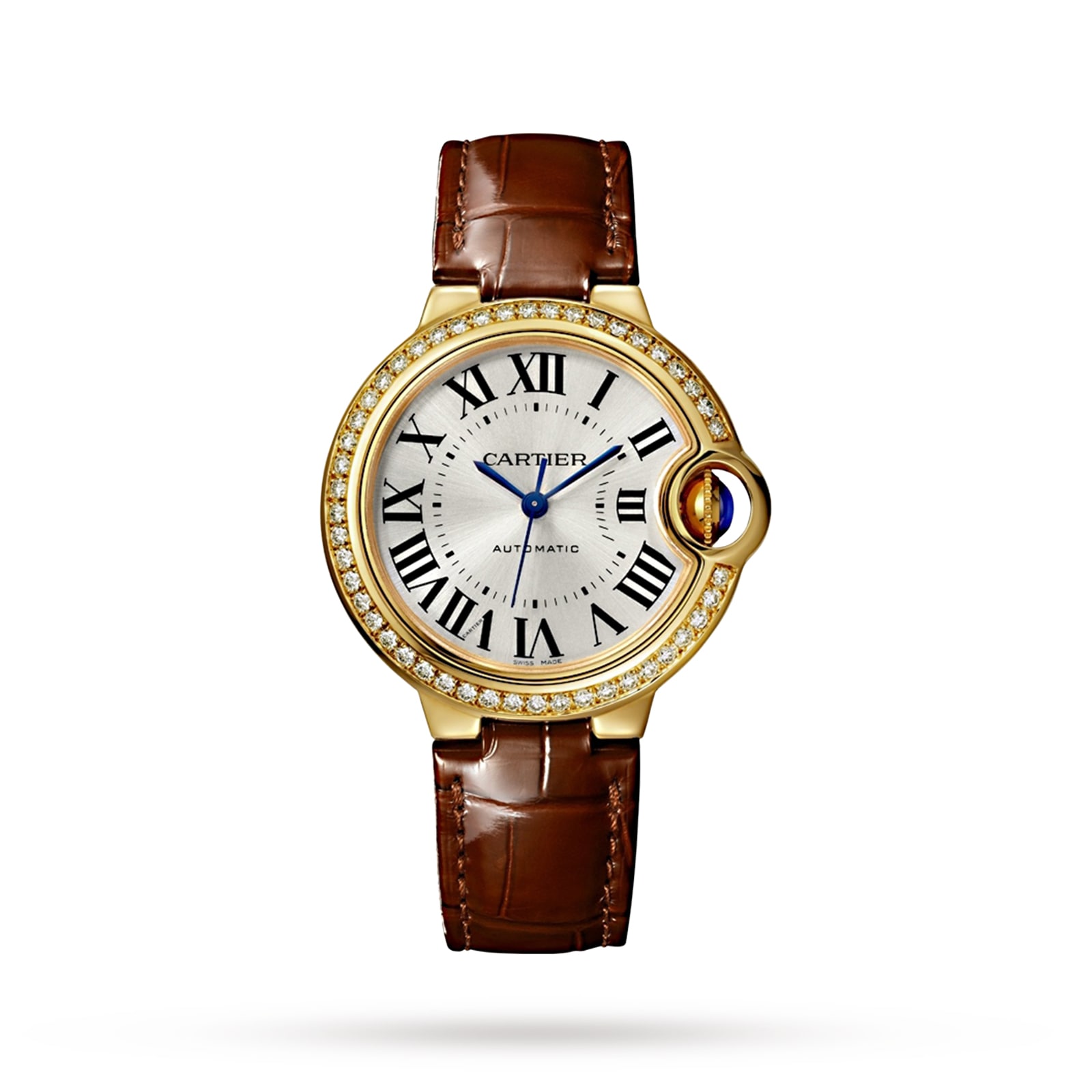 Ballon Bleu de Cartier watch, 33 mm, mechanical movement with automatic winding. Yellow gold 750/1000 case set with brilliant-cut diamonds. Fluted crown decorated with a sapphire cabochon. Silvered sunray-brushed dial. Blued-steel sword-shaped hands. Sapphire crystal. Brown alligator-skin strap, yellow gold 750/1000 ardillon buckle. Case thickness: 10 mm. Water-resistant to 3 bar (approx. 30 metres).