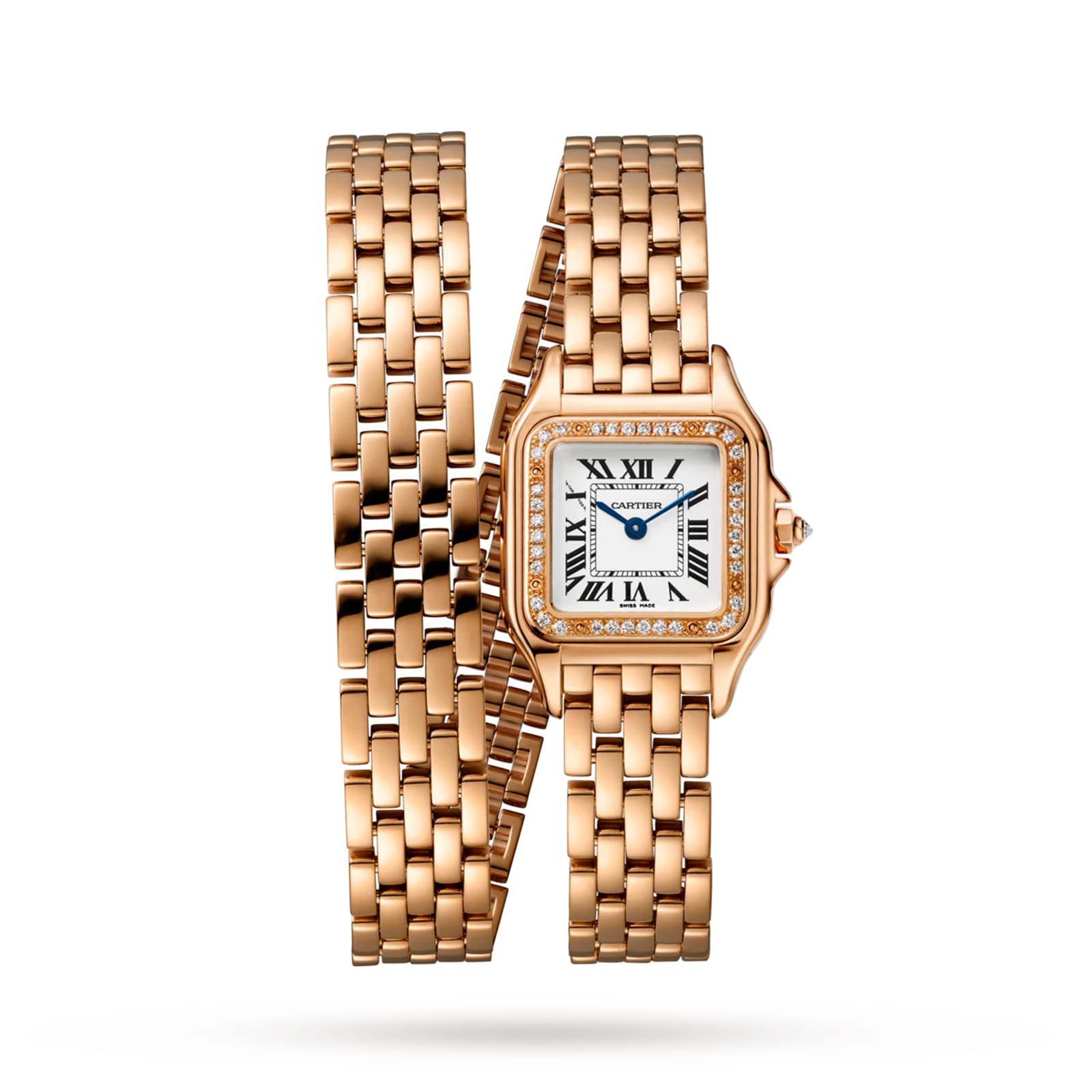 Panth re de Cartier watch, small model, quartz movement. Case in rose gold 750/1000 set with brilliant-cut diamonds, dimensions: 22 mm x 30 mm, thickness: 6 mm, crown set with a diamond, silvered dial, blued-steel sword-shaped hands, rose gold 750/1000 double loop bracelet, water-resistant to 3 bar (approx. 30 meters).