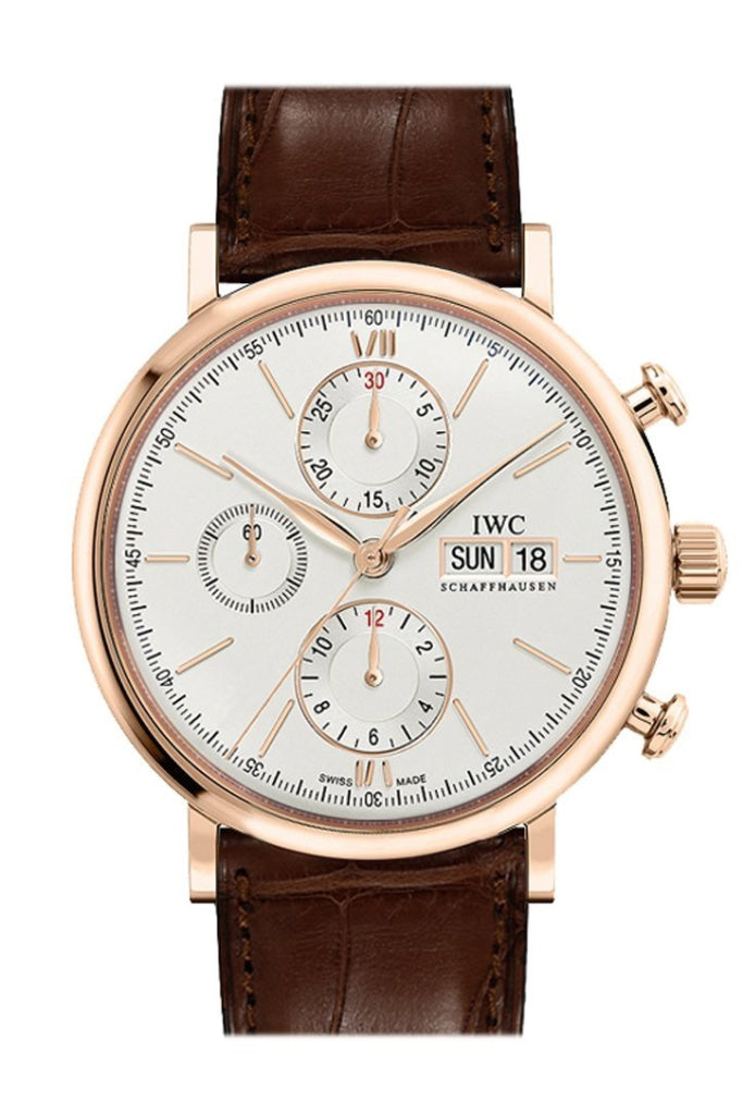 18kt rose gold case with a dark brown alligator leather strap. Fixed 18kt rose gold bezel. Silver dial with rose gold hands and index hour markers. Roman numerals mark the 6 and 12 o'clock positions. Minute markers around the outer rim. Dial Type: Analog. Day of the week and date display at the 3 o'clock position. Chronograph - three sub-dials displaying: 60 second, 30 minute and 12 hour. Automatic movement with a 44 hour power reserve. Scratch resistant sapphire crystal. Pull / push crown. Solid case back. Case diameter: 42 mm. Case thickness: 13.5 mm. Round case shape. Tang clasp. Water resistant at 30 meters / 100 feet. Functions: chronograph, day, date, hour, minute, second. Luxury watch style. Watch label: Swiss Made. IWC Portofino Chronograph Silver Dial Brown Alligator Leather Mens Watch IW391020.