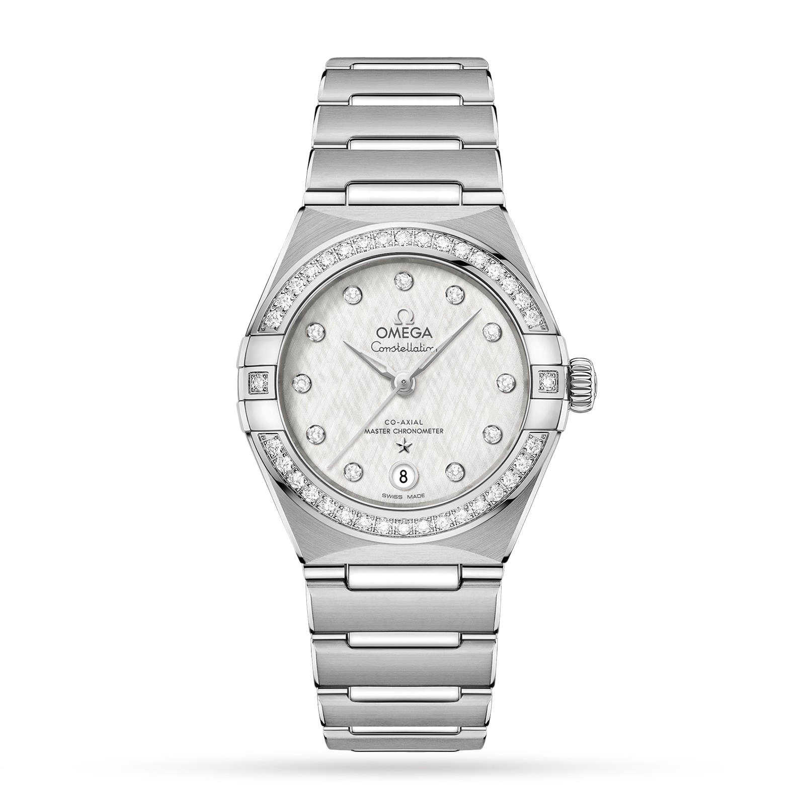 This 29 mm stainless steel model features a diamond-paved bezel, white silvery dial with silk-like pattern, diamond hour markers and a date window at the 6 o'clock position. The hands, OMEGA logo, Constellation star and diamond holders are in 18K white gold.