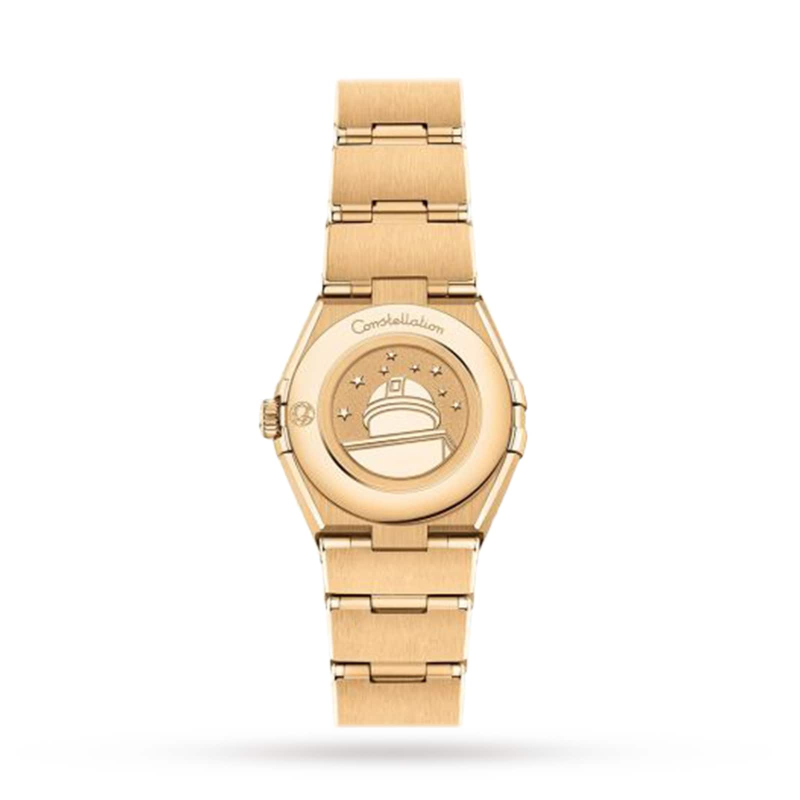 This 25 mm 18K yellow gold model features a diamond-paved bezel, white mother-of-pearl dial with diamond hour markers and scratch-resistant saphire crystal. The bracelet, hands, OMEGA logo, Constellation star and diamond holders are also in 18K yellow gold.