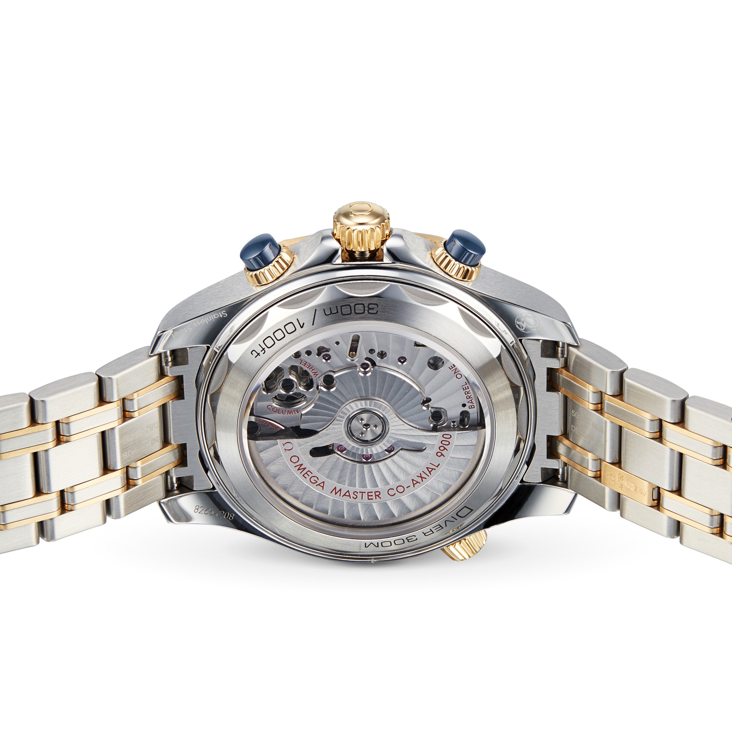 This 44mm chronograph model of the iconic Seamaster Diver 300M has a stainless steel and 18K yellow gold case and a polished blue ceramic bezel with Ceragold diving scale. The chronograph pushers and laser-engraved dial are also blue ceramic.