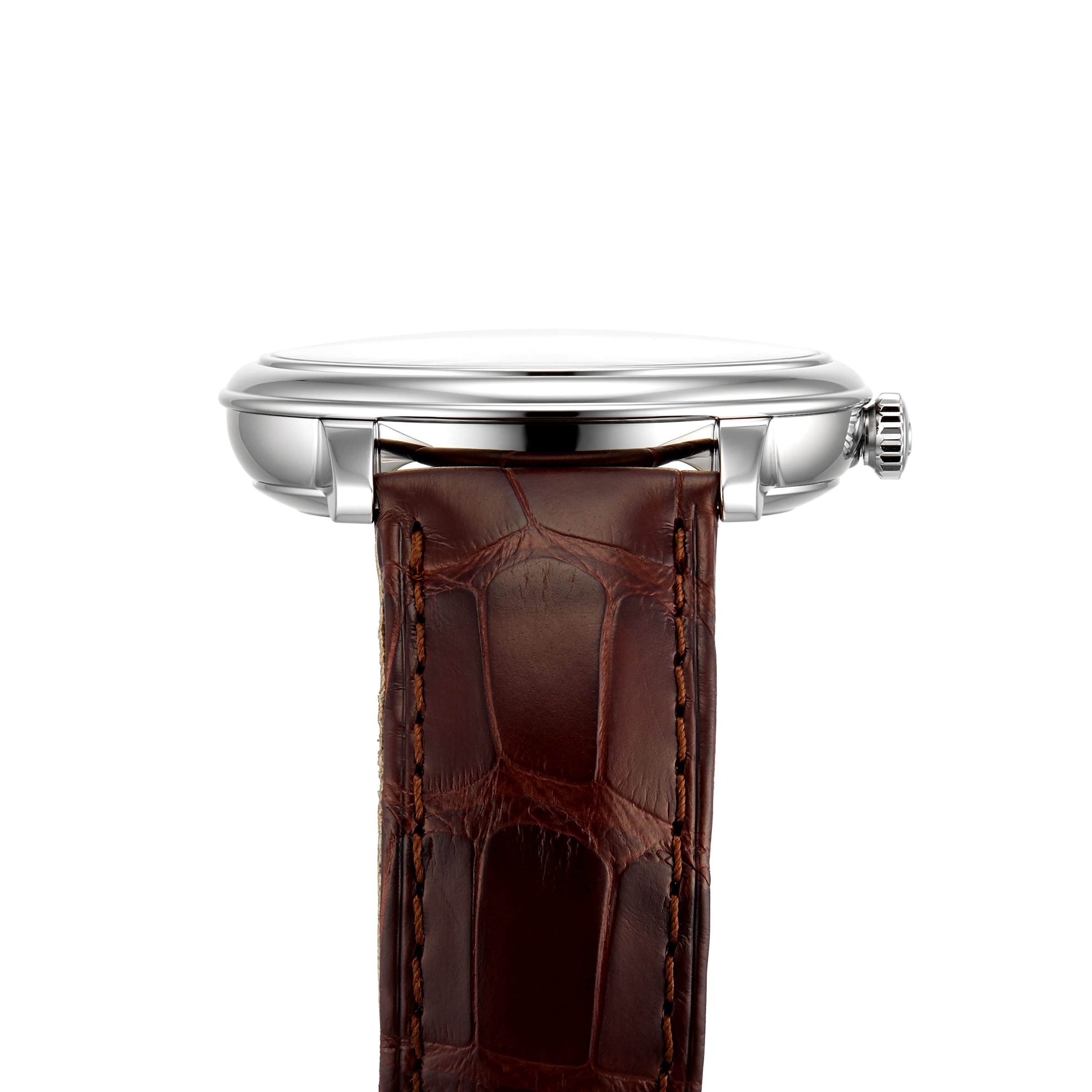 This 39.5mm model features a stainless steel case, paired with a brown leather strap.